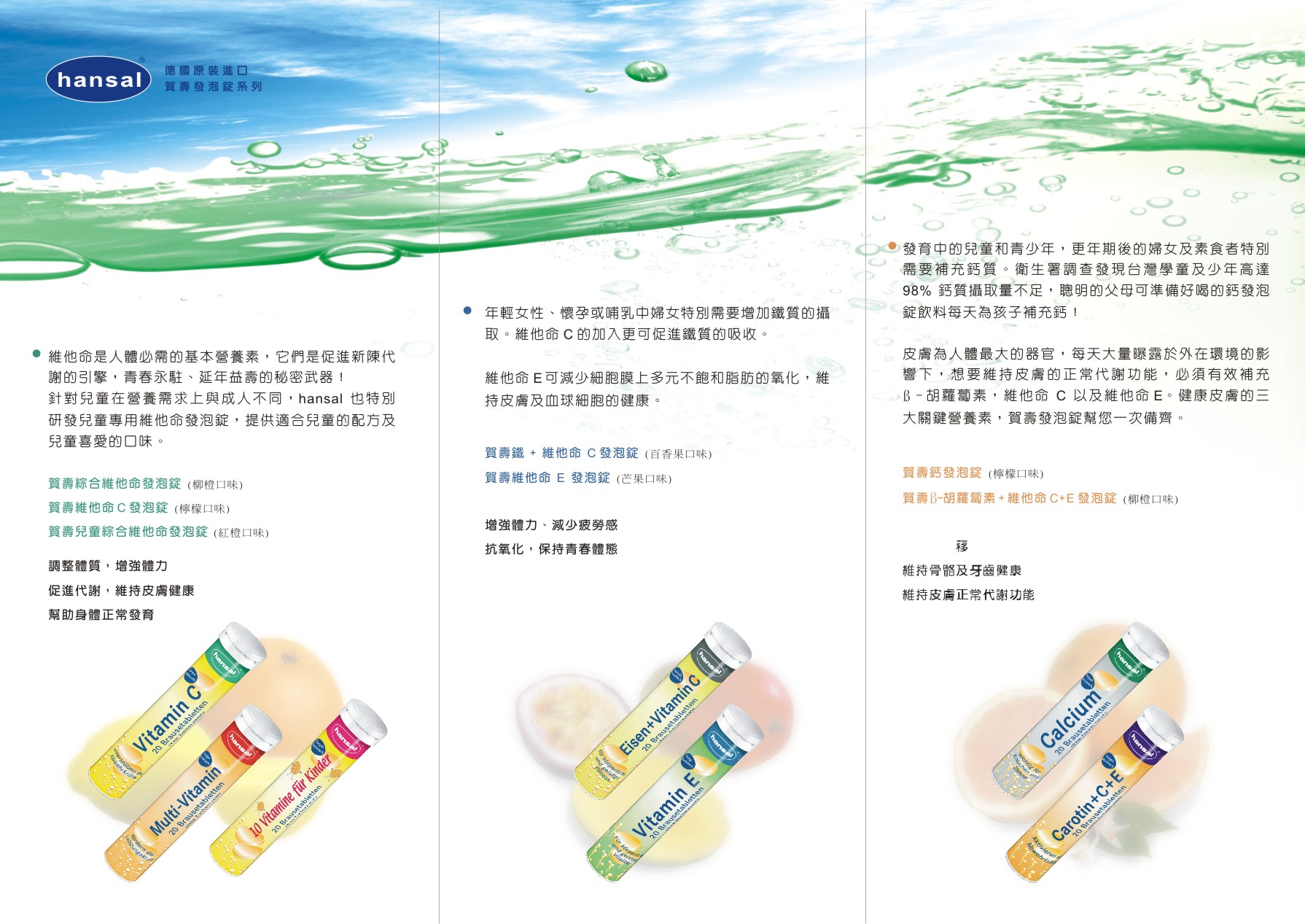 hansa-pharm 的研發團隊實力堅強,致力於高品質原料的開發、努力在產品的穩定性、溶解度及溶解速度上取得最佳平衡,更細心調配出優質的水果口感,除了一般常見的柳橙及檸檬口味外,也開發出獨特的百香和芒果口味,讓您與家人在享受健康的發泡錠飲品的同時,能有更多樣的選擇與樂趣。此外,hansal 也將發泡錠飲品中常見的色素問題盡量減到最低,盡可能以減少添加或不加色素的方式,或是用天然的甜菜根粉來取代人工色素,讓發育中的小朋友減少人工色素的食用,快樂成長。 賀壽hansal全系列產品都經過德國嚴謹的食品安全控制系統的控管,所有公司貨產品皆投保了富邦產品責任險七千萬元整,讓您與家人維護健康有品質,消費安心有保障。 ![]() 產品型錄